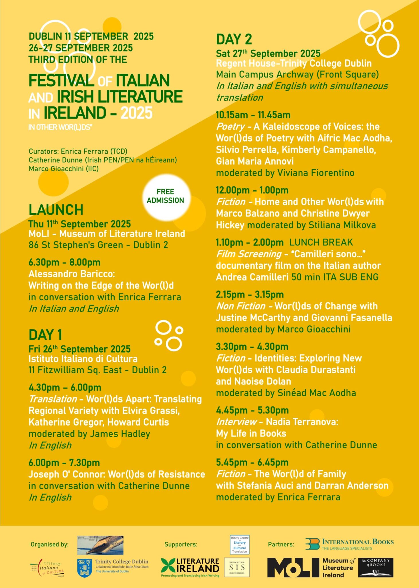 Please explore the programme of FIILI 2025 at this link: https://www.tcd.ie/ahss/news-and-events/events/festival-of-italian-and-irish-literature-in-ireland-2025/